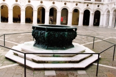 В нижней аркаде 36 колонн – и капители у них почти все разные! Какие сюжеты изображены на них подробно, с чувством, толком, расстановкой рассказано у Дж. Раскина в «Камнях Венеции». На верхней аркаде со стороны Пьяцеты есть 2 колонны розоватого цвета (9 и 10 колонны от ворот) – место, откуда читали приговоры и чуть ли не вешали между ними предателей. Предательство интересов Венеции в разных формах (политических, экономических или каких других) – самое страшное преступление.